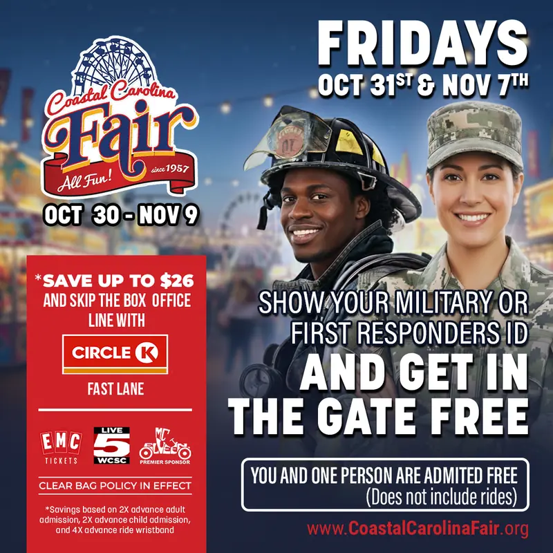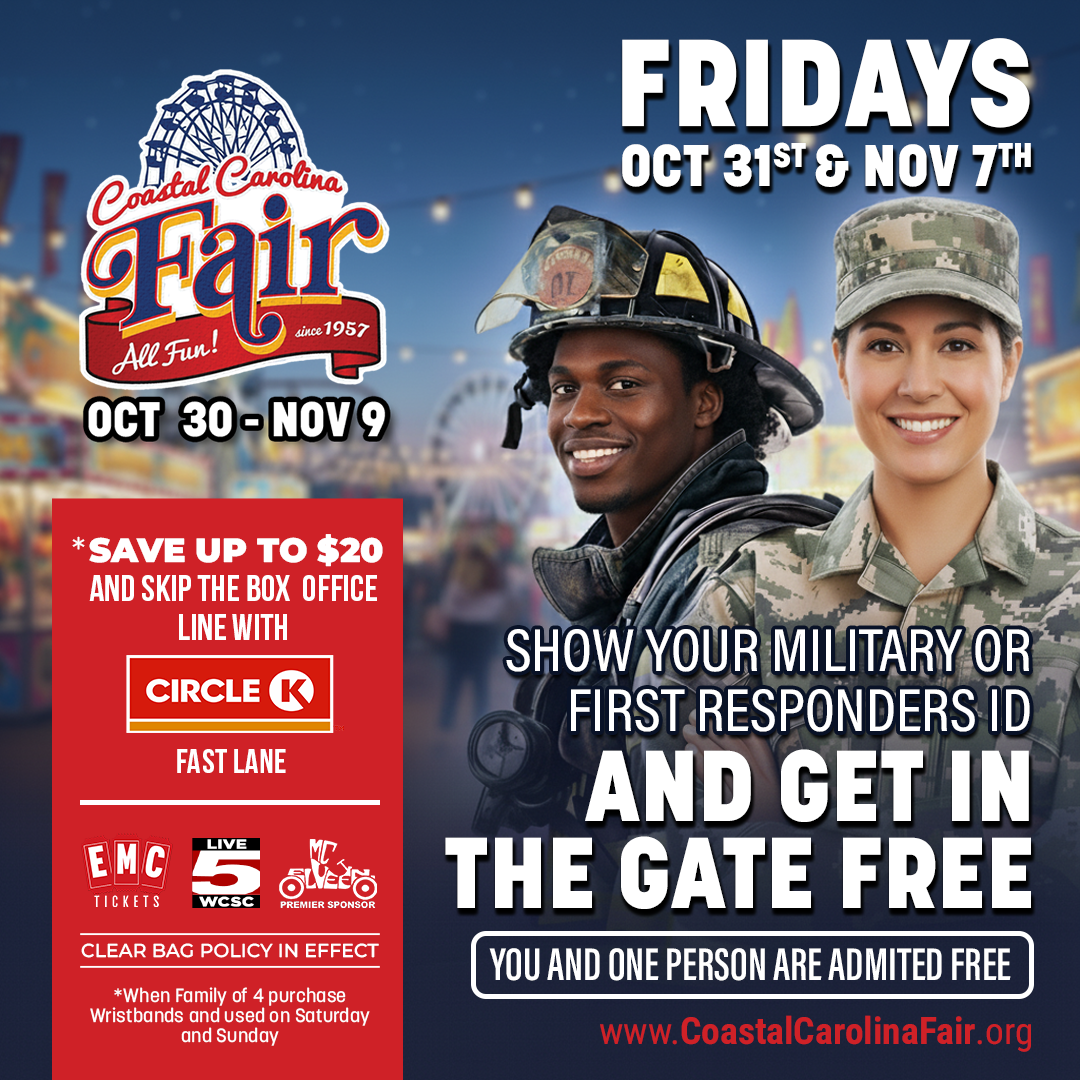 Active Duty, Retired, Veterans, and Reservists, as well as current First Responders and 911 dispatchers from Berkeley County, Charleston County, Dorchester County Consolidated Dispatch are admitted free with 1 guest. VALID ID REQUIRED.